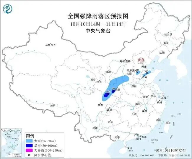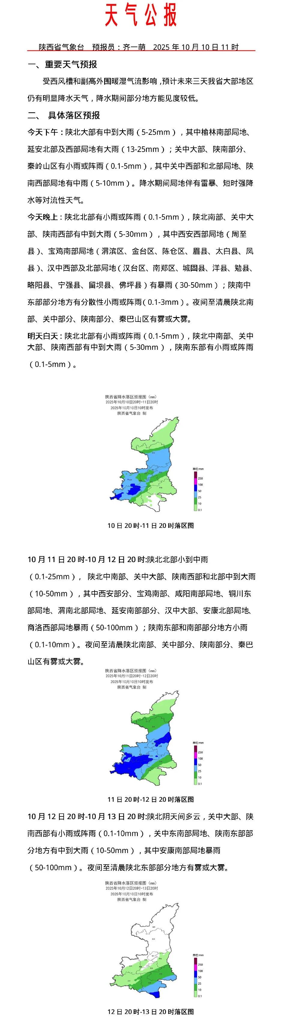 西安市氣象台2025年10月10日16時發佈重要天氣報告:受西風槽和低層切變共同影響,今天夜間至12日夜間西安市將出現大範圍較強降雨天氣,明顯降雨時段在12日凌晨至下午,過程累積雨量50~80毫米,局地可達100毫米以上。