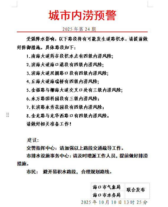 雷雨大風+城市內澇預警!海口這些路段或積水
