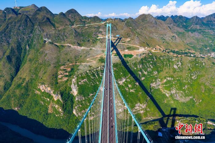 9月28日,世界第一高橋——貴州六枝至安龍高速公路花江峽谷大橋正式通車運營。(無人機照片) 中新社發 龍建睿 攝