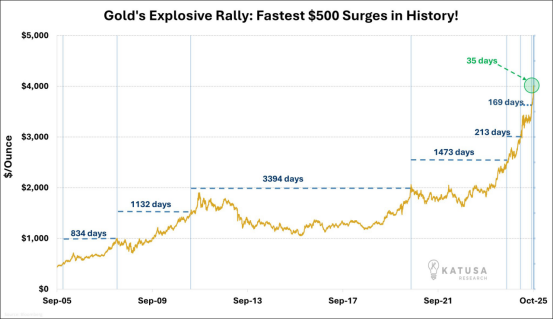 此次金價上漲堪稱"史上最快價值增長"。歷史數據顯示,國際現貨黃金從每盎司1500美元攀升至2000美元耗時3394天,突破3000美元用了213天,而從3500美元到4000美元僅用35天,今年以來累計漲幅已達53%。這一漲勢背後,是黃金市場定價邏輯的根本性轉變——其核心價值已從普通商品升級為"貨幣體系穩定器"與"跨週期風險對沖工具",主權儲備配置、去美元化需求、資產組合分散化等制度性因素成為定價關鍵。