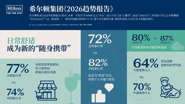 上海2025年10月10日 /美通社/ -- 希爾頓集團今日正式發佈《2026年趨勢報告》,指出未來一年,旅行者將重新定義"出行",旅行不再只是"去哪裏",而是"為何而行"。全球旅行者正在積極擁抱"Whycation"[1]這一新趨勢——一種由情感驅動的旅行方式,源於對安靜的休憩、重聚和連接,以及有意義體驗的渴望。
