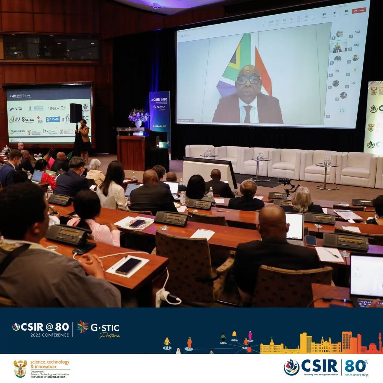 本屆G-STIC會議首次在非洲舉辦,深度聚焦非洲大陸實現可持續發展目標的獨特潛力與挑戰。大會與非洲重要科研機構CSIR雙年會同步舉辦,時值CSIR成立80週年,兩大盛會聯動產生顯著協同效應,既展示非洲本土科研創新成果,又通過G-STIC全球網絡引入國際先進經驗,共同探索適合非洲發展需求的本土化解決方案。南非科技與創新部部長布萊德·恩齊曼迪等多位政府官員出席大會開幕式。