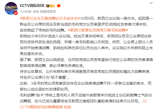 10月9日,新西蘭眾議院一度休會。起因是一羣坐在公眾席的觀眾在新當選的毛利黨女議員奧裏伊尼·凱帕拉發表首次演講後,自發跳起了傳統的毛利戰舞。