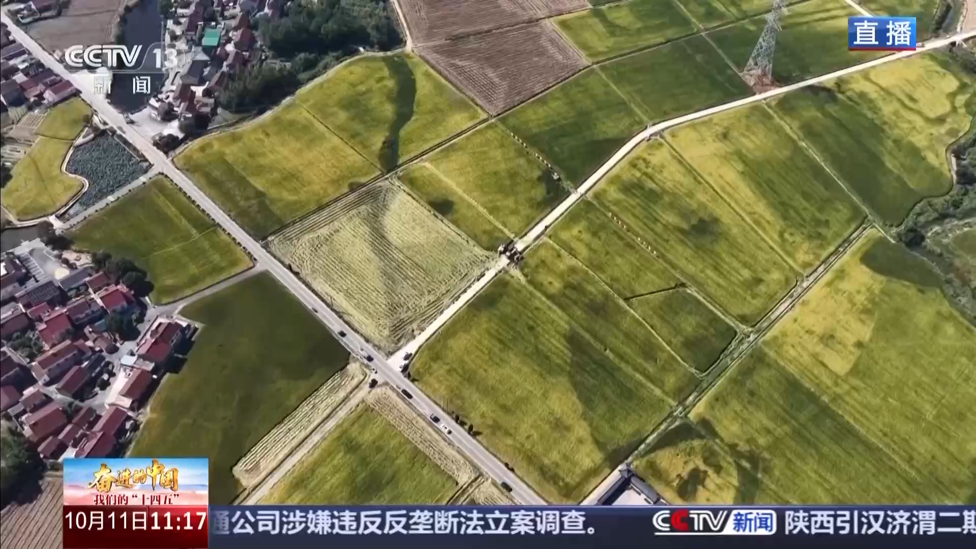 *總枱央視記者 田琪永:*我現在所在的位置是安徽省廣德市誓節鎮紅應村的萬畝水稻示範區。我身後是一片金黃的稻田,收割機正開足馬力,在田間穿梭收穫水稻。另一邊,技術人員正在現場測產,科學選點、測量穗數、粒數、千粒重,就能在收割完成之前,相對準確地測量出這塊田的產量。我們先從這片稻田開始,看看這裏為了水稻單產提升,做了哪些準備工作。