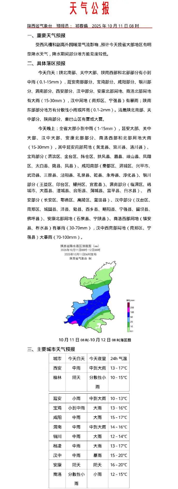 預計10月11日9時至10月12日9時,西安市灞橋區、臨潼區、長安區、鄠邑區、藍田縣、周至縣,寶雞市渭濱區、金台區、陳倉區、鳳翔區、岐山縣、扶風縣、眉縣、隴縣、千陽縣、麟遊縣、鳳縣、太白縣,咸陽市三原縣、涇陽縣、乾縣、禮泉縣、永壽縣、長武縣、旬邑縣、淳化縣、武功縣、興平市、彬州市,銅川市王益區、印台區、耀州區、宜君縣,渭南市臨渭區、華州區、潼關縣、大荔縣、合陽縣、澄城縣、蒲城縣、白水縣、富平縣、韓城市、華陰市,延安市寶塔區、延長縣、富縣、洛川縣、宜川縣、黃龍縣、黃陵縣,漢中市漢台區、南鄭區、城固縣、洋縣、西鄉縣、勉縣、寧強縣、略陽縣、留壩縣、佛坪縣,安康市寧陝縣等縣(市、區)發生山洪災害可能性較大(黃色預警),西安市新城區、碑林區、蓮湖區、未央區、雁塔區、閻良區、高陵區,咸陽市秦都區、楊陵區、渭城區,延安市安塞區、延川縣、志丹縣、甘泉縣,榆林市清澗縣,漢中市鎮巴縣,安康市石泉縣,商洛市商州區、洛南縣、鎮安縣、柞水縣等縣(區)有可能發生山洪災害(藍色預警)。請各地各部門落實防禦責任,緊盯危險區與強降雨重疊區,加強實地監測與預警叫應,提前做好轉移避險防範。