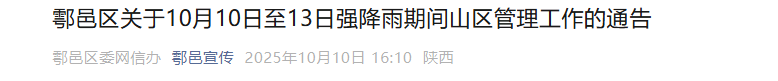 為有效應對10月10日至10月13日降水天氣過程,確保人民羣眾生命安全,自10月10日18時起至本輪降雨結束,對我區秦嶺山區所有峪口實施封閉管理,現就有關事項通告如下: