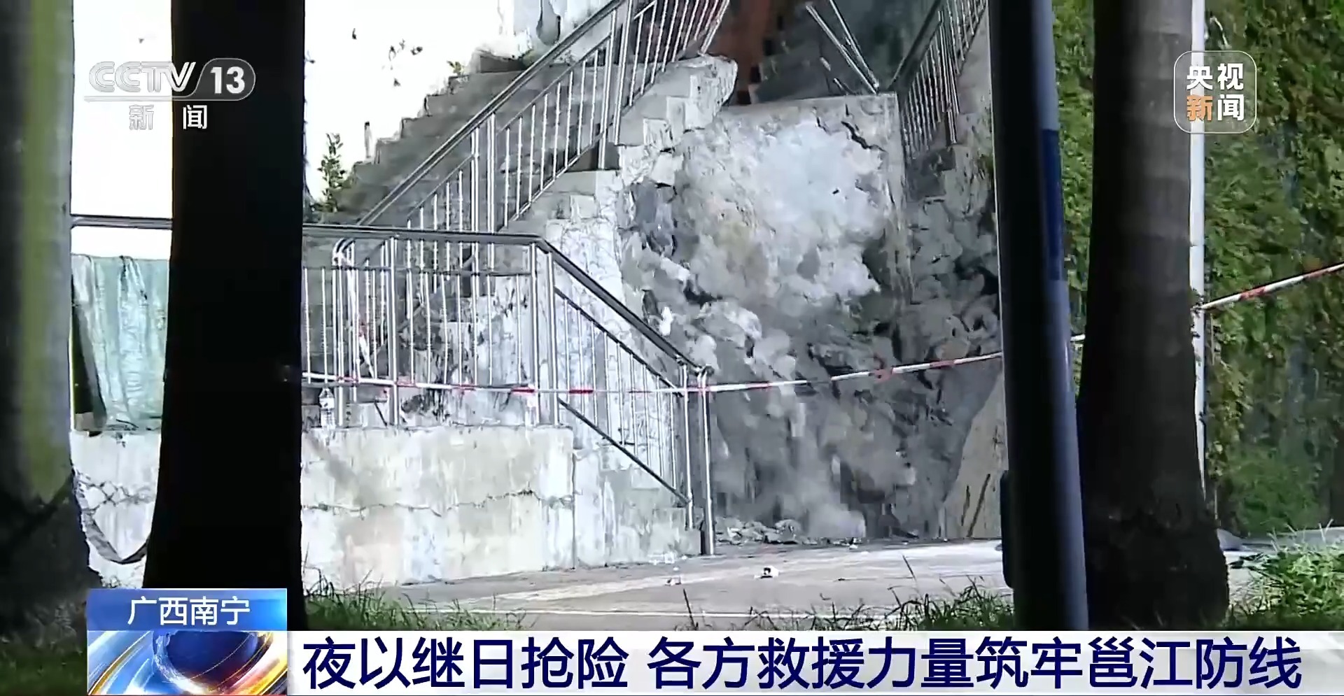 就在填充工作緊張推進的同時,陷坑北面靠近邕江一側的水泥扶梯突然垮塌。鑑於險情有所升級,凌晨2點,在靠近事發現場最近的北大南社區,社區幹部連夜勸導、組織低樓層的住户們有序轉移。