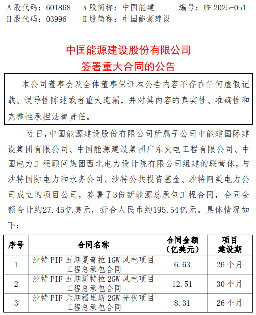 同日,中國能建所屬聯營體亦斬獲大單,與由沙特國際電力和水務公司、沙特公共投資基金(PIF)、沙特阿美電力公司共同成立的項目公司,簽署了3份新能源總承包工程合同,總金額高達27.45億美元(約合195.54億元人民幣)。這批項目包括總裝機3GW的兩個大型風電項目和總裝機2GW的一個大型光伏項目,建設週期在26至30個月之間。