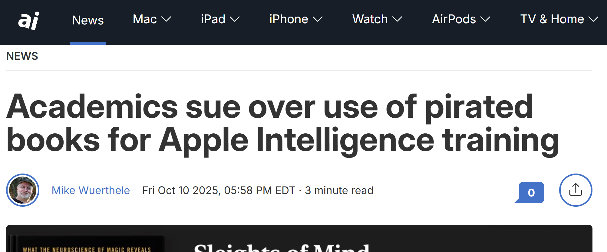 【環球網科技綜合報道】10月11日消息,據科技媒體 Appleinsider 報道,美國紐約州立大學健康科學大學的兩名學術作者蘇珊娜・馬丁內斯-康德與斯蒂芬・麥克尼克,近日以版權侵權為由對蘋果公司提起集體訴訟,指控其“蘋果智能”(Apple Intelligence)AI系統在訓練過程中,非法使用包含兩人著作盜版內容的數據庫,相關案件引發行業對AI訓練數據版權合規問題的廣泛關注。