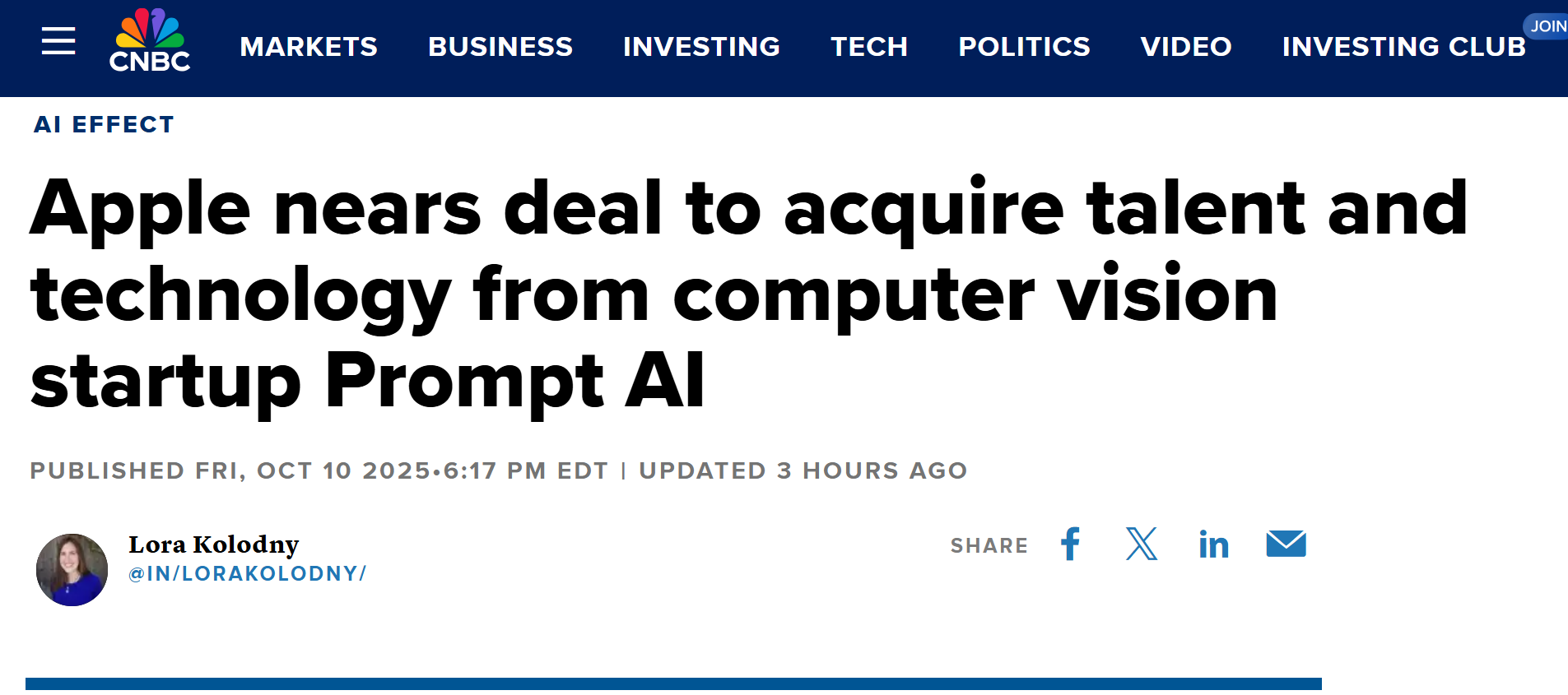 【環球網科技綜合報道】10月11日消息,據CNBC報道,蘋果公司正與計算機視覺領域初創企業 Prompt AI 就收購事宜推進 “最後階段談判”,計劃將後者核心技術及相關人才納入麾下,此舉被業內視為蘋果加碼智能家居安全與視覺感知生態建設的重要動作。