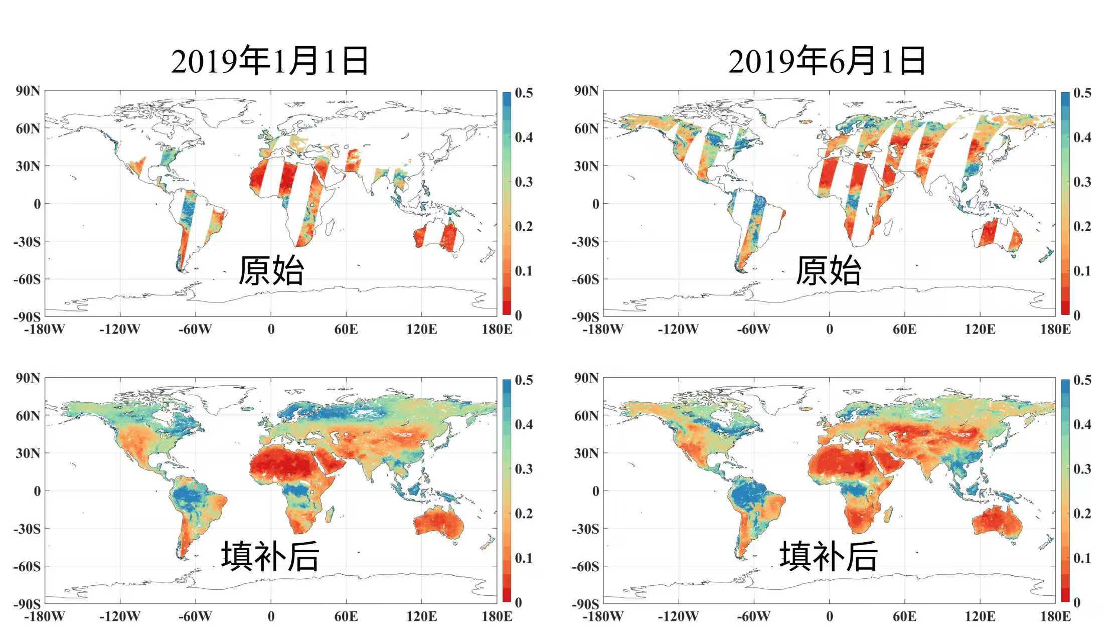 “當前填補缺失數據主要有兩類方法:一類是傳統插值法,依賴已知數據推測缺失區域,適用於小範圍缺失,但在大片空白區容易失效;另一類是基於大數據分析的機器學習方法,能夠通過分析全球數據,尋找土壤水分與降雨、植被等因素間的聯繫來進行預測,但結果容易趨向‘平均’,難以準確反映特別乾旱或濕潤地區的真實情況。”曾江源介紹。