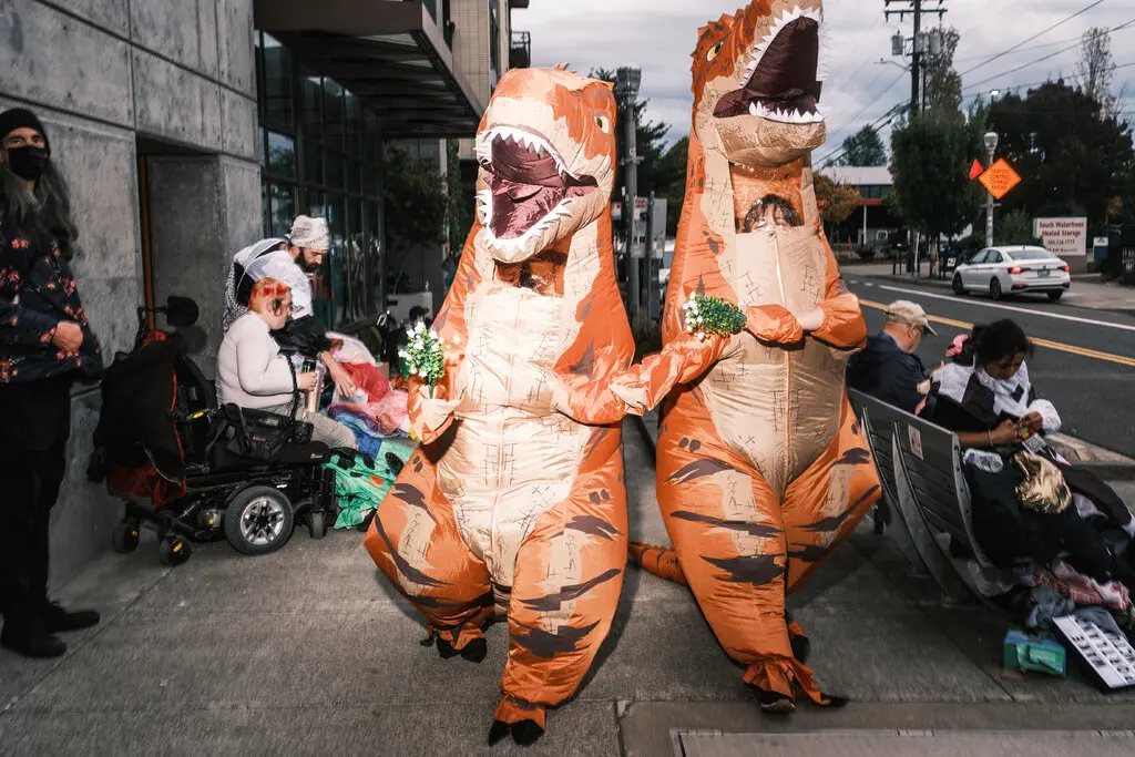 反駁“戰區”説法!美波特蘭市抗議者扮成“青蛙、恐龍”,抗議特朗普政府向當地派兵