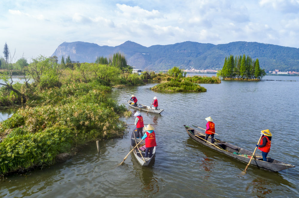 2023年3月20日,巾幗打撈隊隊員在雲南昆明滇池草海打撈水草(無人機照片)。在雲南昆明滇池邊,活躍着一支由當地婦女組成的巾幗打撈隊。數十年來,她們駕駛船隻打撈滇池及周邊入湖河道、濕地的垃圾、雜草等。