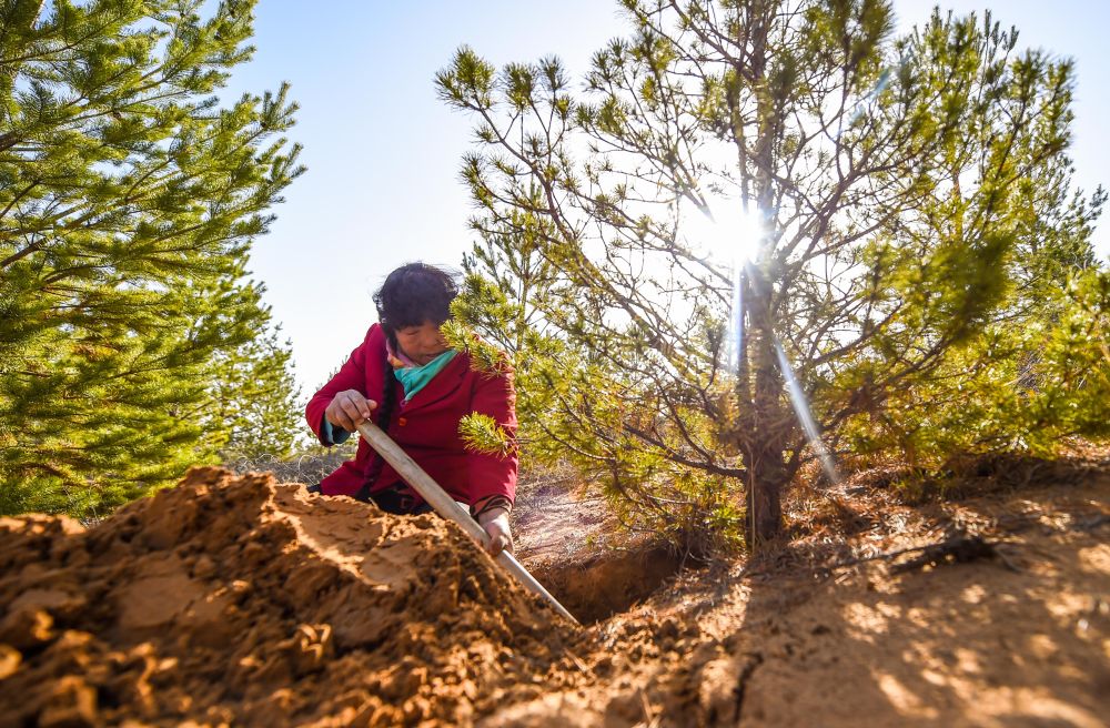 2021年3月23日,殷玉珍在內蒙古毛烏素沙漠挖土,查看松樹根部的生長情況。20世紀80年代,殷玉珍嫁到這片沙地時,眼前只有漫無邊際的黃沙。1986年,她埋下第一棵樹苗,從此與風沙較勁。如今,7萬多畝荒沙披上了綠裝,治理好的土地上種起了小米,金燦燦的穀穗成了“沙漠黃金”。