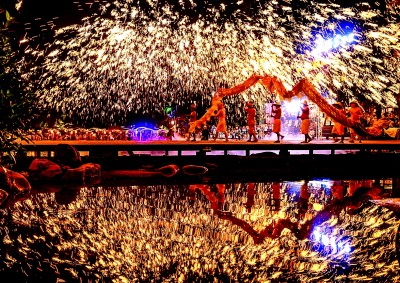 10月5日,在四川省成都市雙流區黃龍溪古鎮,民間藝人表演非遺“火龍燈舞”。新華社發