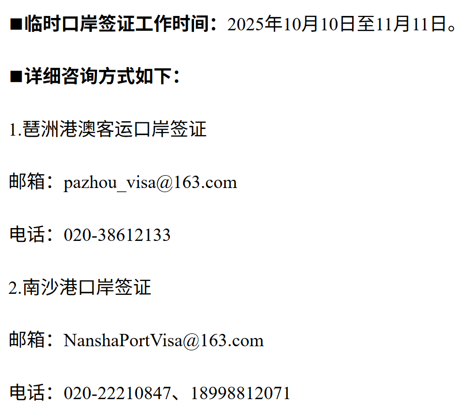 第138屆廣交會舉辦期間,廣州公安出入境部門在琶洲港澳客運口岸、南沙港口岸分別臨時開展口岸簽證工作,為持有廣交會相關邀請函件的外國人簽發相應簽證,為符合簽發條件的港澳居民、台灣居民分別簽發三個月一次出入境有效中華人民共和國出入境通行證、三個月一次出入境有效台灣居民來往大陸通行證。