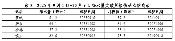 *4. 秋雨開始早,秋雨期偏長。*2025年華西秋雨(陝西區)於9月2日開始,較常年(9月12日)偏早10天。截至10月9日,秋雨長度已達38天,較常年偏長14天,秋雨區大部降水日數18~31天。秋雨綜合強度等級顯著偏強,為1961年以來第8強,2000以來第5強。