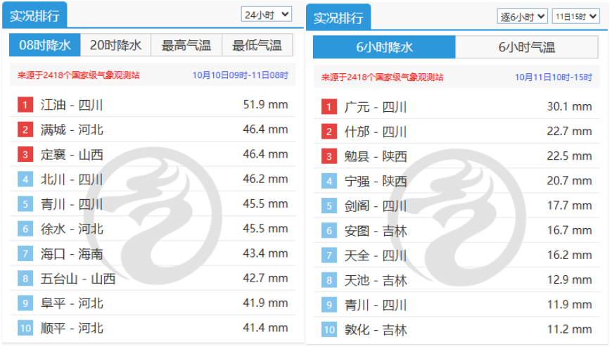 據中央氣象台,10日9時到11日15時,四川多個站點登上全國降水量TOP10榜單,主要集中在廣元、綿陽、德陽區域,青川縣。
