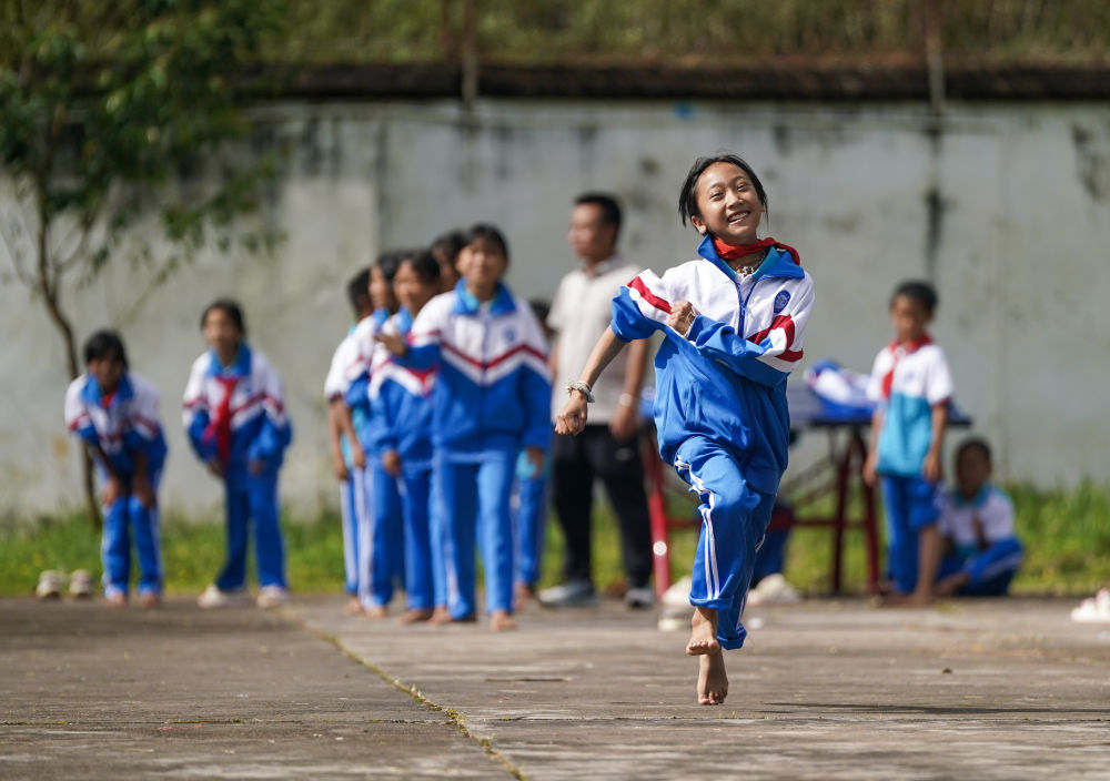 2025年9月15日,雲南省普洱市孟連傣族拉祜族佤族自治縣臘福小學學生課間在操場進行奔跑接力比賽。新華社記者 陳欣波 攝