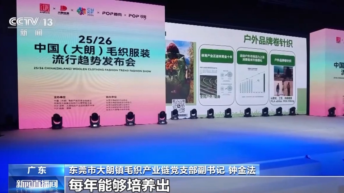 *東莞市大朗鎮毛織產業鏈黨支部副書記 鍾金法:*經過十多年的發展,大朗毛織已經有研發以及工藝設計技術人員3000名,每年能夠培養出設計方面的人才大概超過200人。