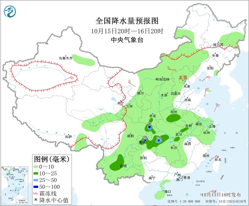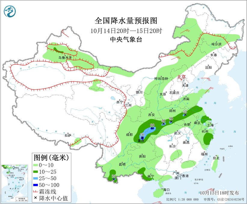 *10月13日20時至14日20時,*新疆沿天山地區、內蒙古東部、吉林西部等地有小到中雪或雨夾雪,局地有大到暴雪;江南中東部和南部、西南地區東部、華南西部等地部分地區有中到大雨,其中,廣西西北部等地部分地區有暴雨(50~60毫米)(見圖1)。
