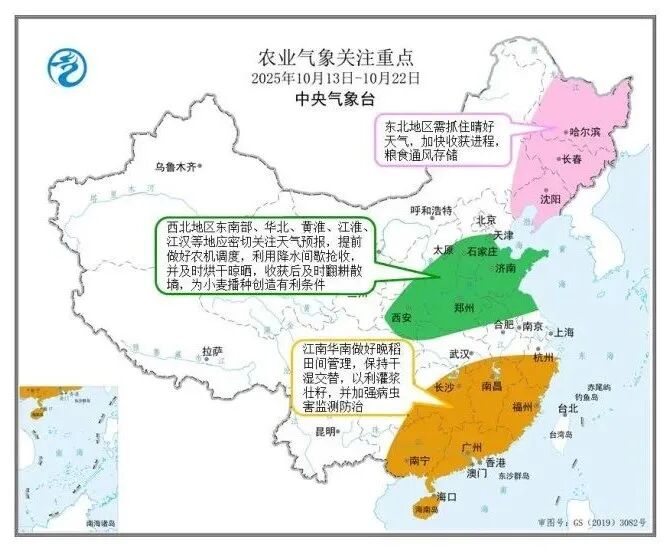 南方地區應抓住有利天氣及時收曬水稻、棉花等作物;做好晚稻田間管理,保持乾濕交替,以利灌漿壯籽,並加強病蟲害監測防治;已收穫地區及時騰茬整地,搶抓階段性降水趁墒播種油菜等作物,江西、湖南等地需做好防旱抗旱準備,造墒推進秋種工作。