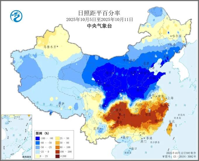 全國日照北少南多,內蒙古中西部、東北地區南部、華北、黃淮、江漢北部、西北地區中東部及四川東北部等地偏少5至9成;江南大部、華南北部、西南地區東部等地日照時數偏多5成至2倍。