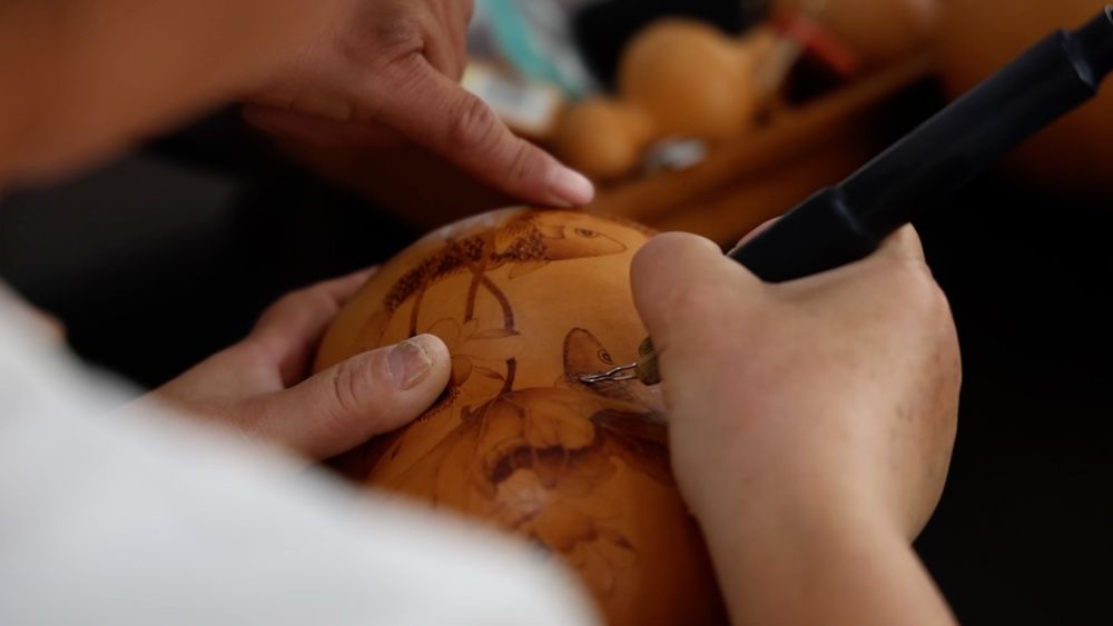 金秋10月,天津市濱海新區太平鎮的田野間,連片葫蘆地迎來豐收。在太平葫蘆特色產業園加工車間,工匠們以鐵為筆,在葫蘆上勾勒出精細的山水、花鳥或福祿圖案。經過打磨、烙畫、拋光等工序,普通葫蘆價值得到大幅提升。