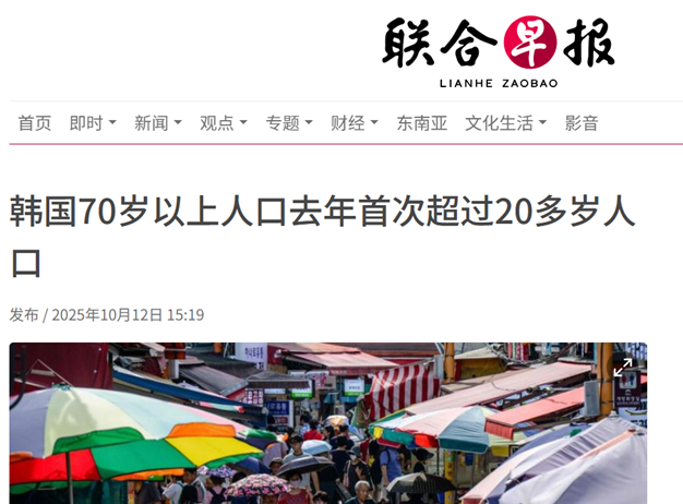 【環球網財經綜合報道】韓聯社報道,韓國國家數據處於10月12日發佈《人口住宅總調查》。統計顯示,受低生育率、人口老齡化影響,韓國20至29歲人口去年首次被70歲以上高齡人口趕超。