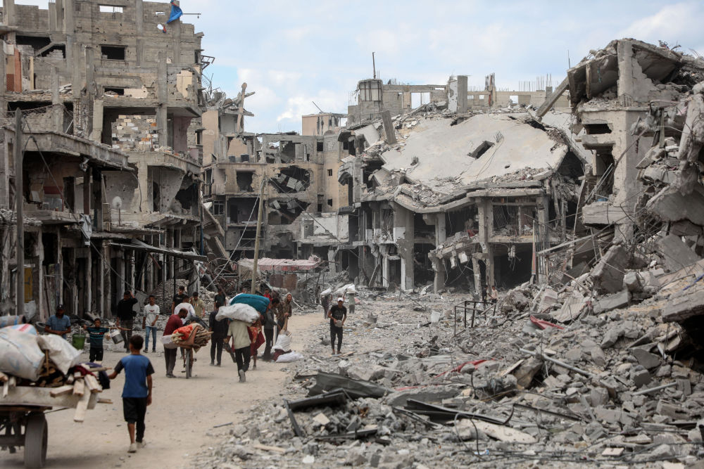 10月12日,在加沙地帶南部汗尤尼斯,重返家園的巴勒斯坦人走過嚴重受損的建築。新華社發(裏澤克·阿卜杜勒賈瓦德攝)