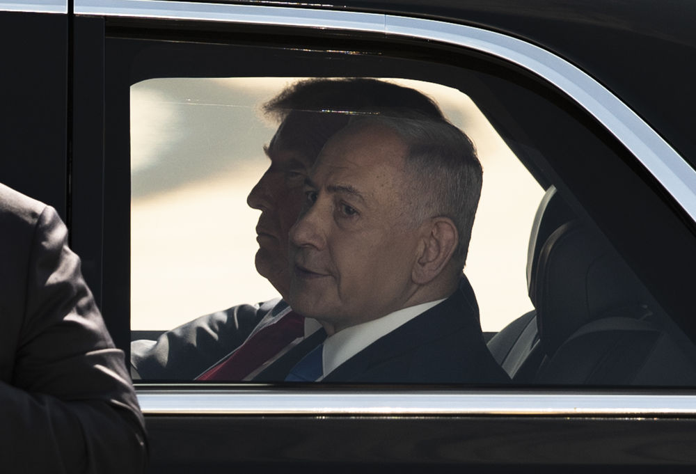 10月13日,在以色列本-古裏安機場,以色列總理內塔尼亞胡(前)同到訪的美國總統特朗普同乘一輛車。新華社記者陳君清攝
