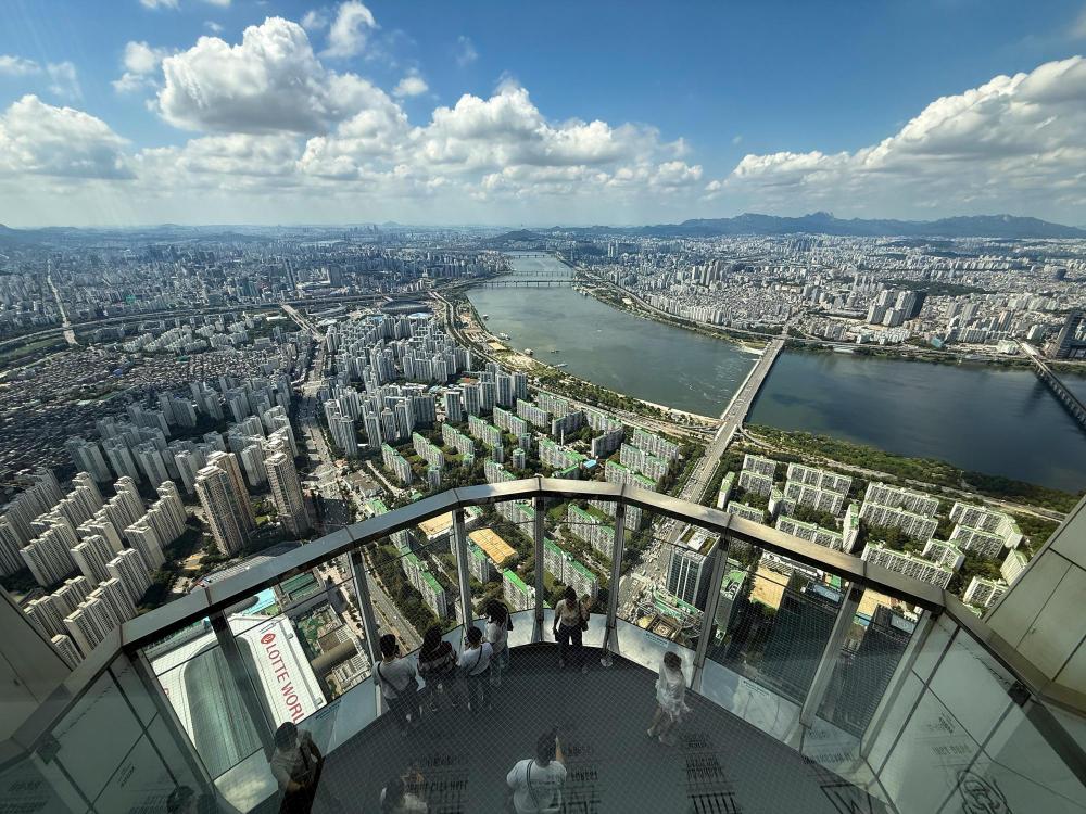 9月5日,遊客在首爾的樂天世界塔高層展望台拍照。新華社發(全休相攝)