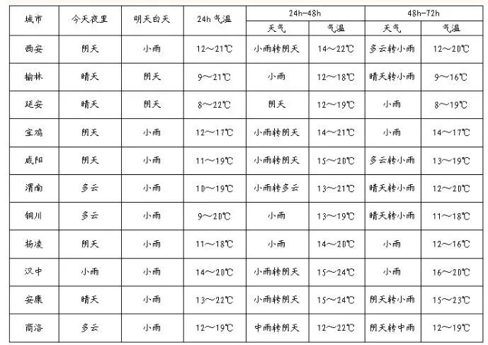 10月21日:陝北、關中東部多雲,關中西部、陝南南部有分散性小雨或陣雨(0.5~10毫米)。