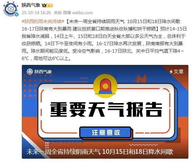 小到中雨、暴雨+降温來襲!陝西發佈重要天氣報告