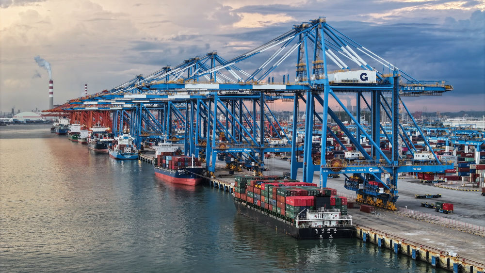2025年9月16日,海輪在欽州港碼頭裝卸貨物(無人機照片)。新華社記者 張愛林 攝