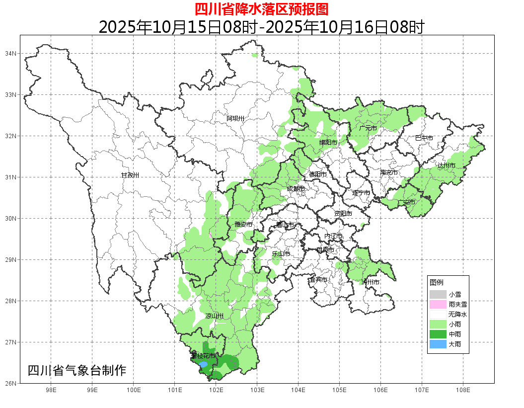15日白天到晚上:盆地多雲間陰,盆周地區有陣雨或雷雨;甘孜州東部、阿壩州東部和攀西地區大部陰天間多雲有陣雨或雷雨,局部有中到大雨,川西高原其餘地方多雲間晴。