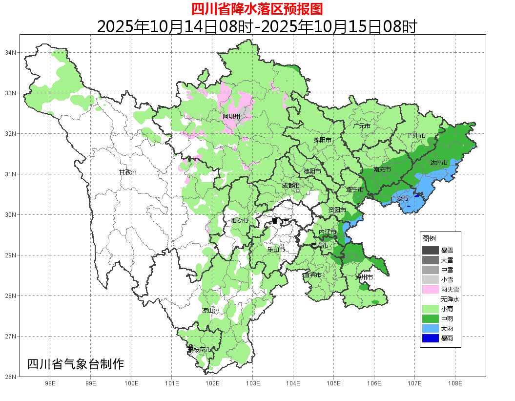 今天(14日)白天到晚上:盆地大部陰天間多雲有陣雨或雷雨,其中達州、廣安、南充3市和巴中、遂寧、資陽、內江、自貢5市東部,瀘州北部有中雨,局部大雨到暴雨;甘孜州西北部東部、阿壩州大部和攀西地區大部 陰天間多雲有陣雨(雪)或雷雨,川西高原其餘地方多雲間晴。