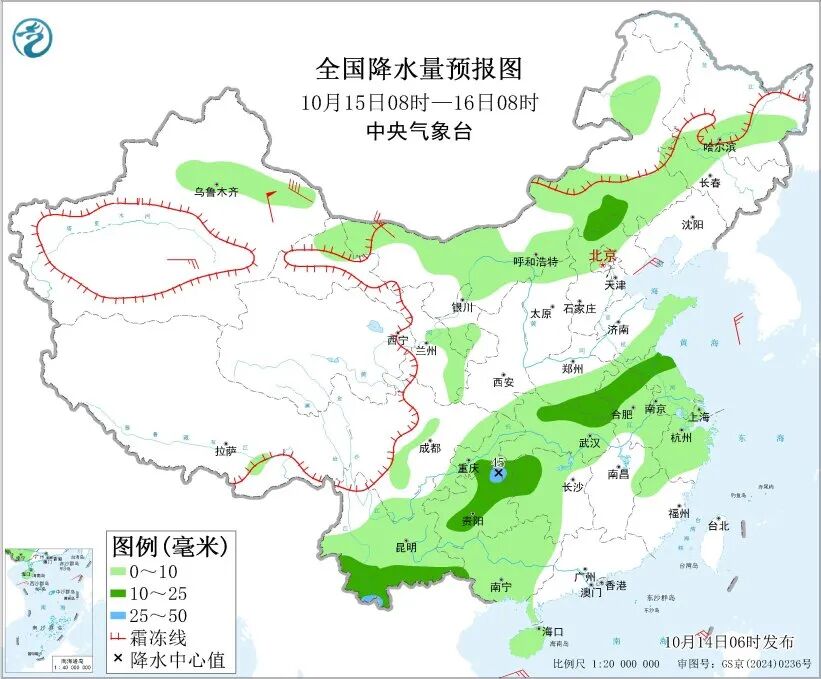 中央氣象台預計,10月14日08時至15日08時,新疆沿天山地區、內蒙古東部、吉林西部、黑龍江南部等地有小到中雪或雨夾雪,局地大到暴雪。黃淮南部、江漢西部和北部、西南地區東部、華南西部、海南島西部等地部分地區有中到大雨。其中,重慶東北部等地局地有暴雨。