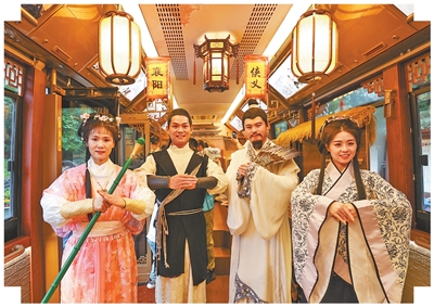 10月5日,湖北襄陽,“黃蓉”“郭靖”“諸葛亮”“黃月英”(從左向右)在“俠義襄陽”旅遊公交上與遊客互動。