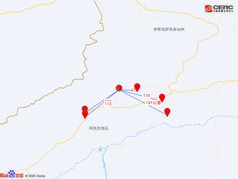 周邊縣城: 震中距拜城縣47公里、距温宿縣107公里、距阿克蘇市113公里、距新和縣114公里、距沙雅縣141公里,距阿克蘇地區112公里,距烏魯木齊市563公里。