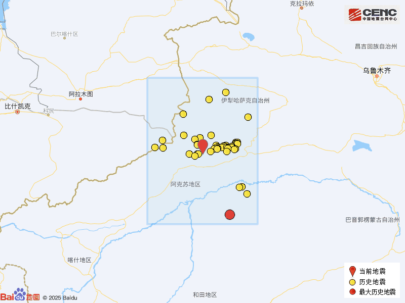 歷史地震: 根據中國地震台網速報目錄,震中周邊200公里內近5年來發生3級以上地震共190次,最大地震是2023年1月30日在新疆阿克蘇地區沙雅縣發生的6.1級地震(距離本次震中217公里),按震級大小前50次歷史地震分佈如圖。