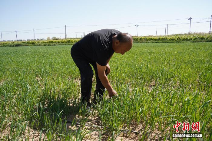 圖為許忠厚查看燕麥草生長情況。 侯旭佳 攝