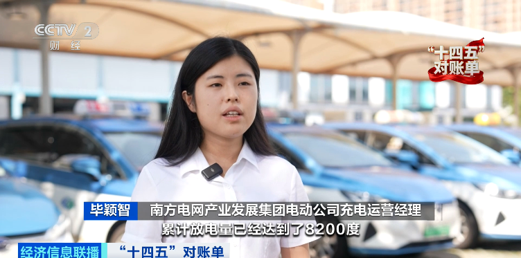 南方電網產業發展集團電動公司充電運營經理 畢穎智:今年我們充電站累計放電量達到了8200度,相當於1025户家庭一天的用電量。