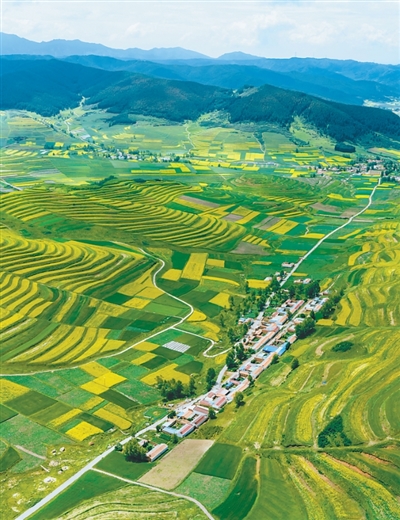 青海省西寧市大通回族土族自治縣,油菜花與麥田交錯嵌套,成為一道亮麗的生態美景。
