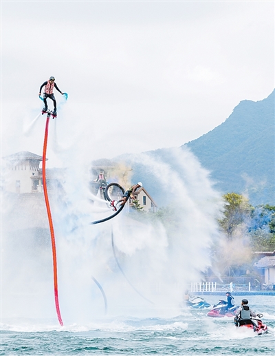 廣東省廣州市增城區,依託廢棄礦湖、温泉等資源打造的森林海旅遊度假區內正在進行水上表演。