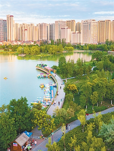 甘肅省蘭州新區棲霞湖碧波輕漾、垂柳依依,成為市民遊客散步休閒的新去處。