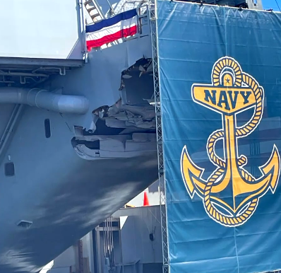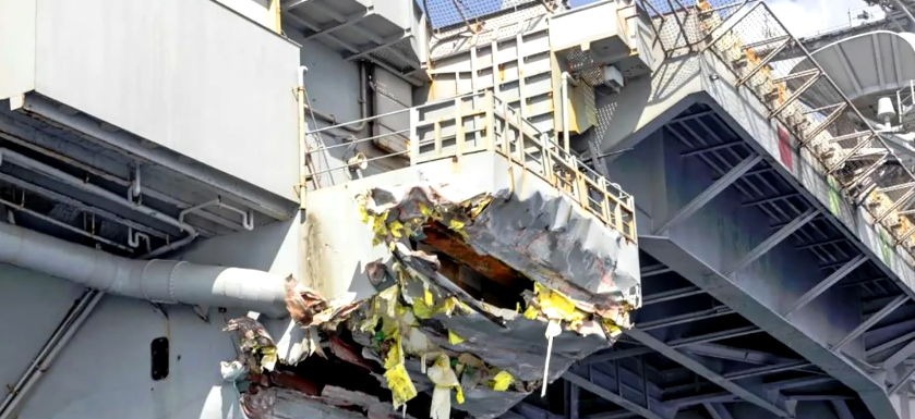 今年2月,*“杜魯門”號在埃及塞得港與一艘商船發生碰撞事故,造成航母右舷升降機附近船舷出現明顯凹痕,周邊管道嚴重變形。*當時,美國海軍並未透露“杜魯門”號的具體受損情況,只表示碰撞造成水線以上損傷、未影響核反應堆安全,“不影響作戰能力”。