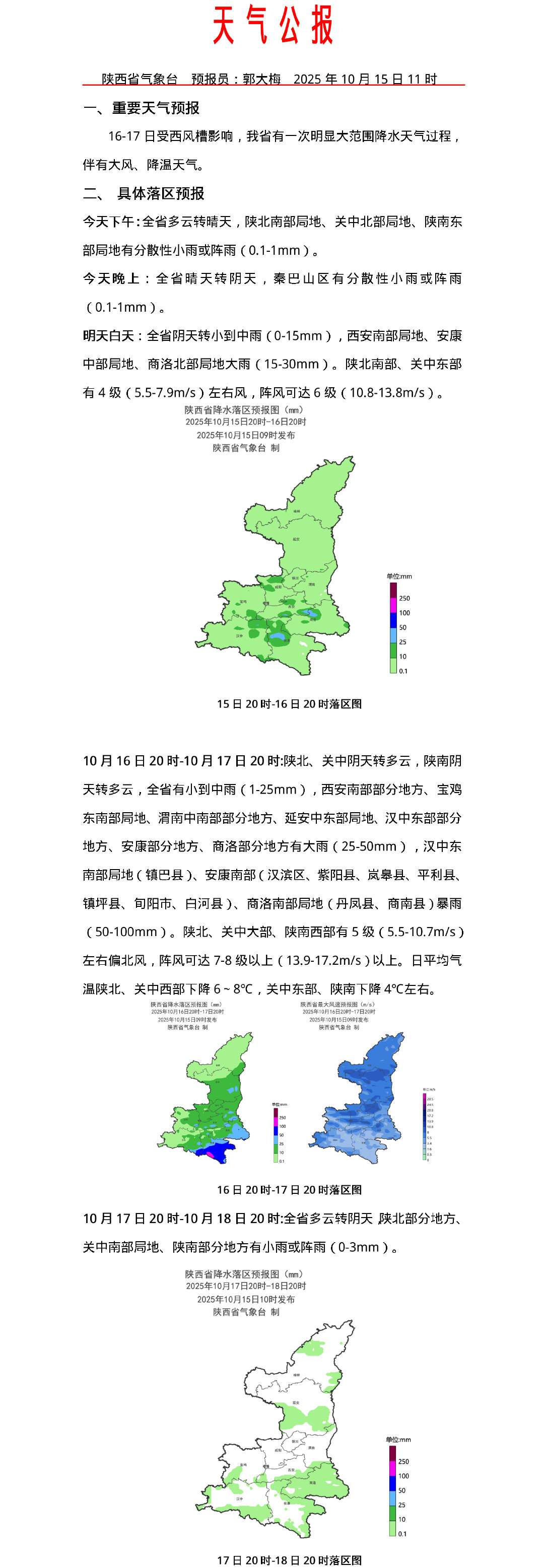 預計今天白天到晚上西安市以多雲到晴天氣為主,明天下午至17日上午有明顯降雨,最強時段在明天晚上,全市有中雨(10~25 毫米)、南部山區大雨(25~45毫米)。