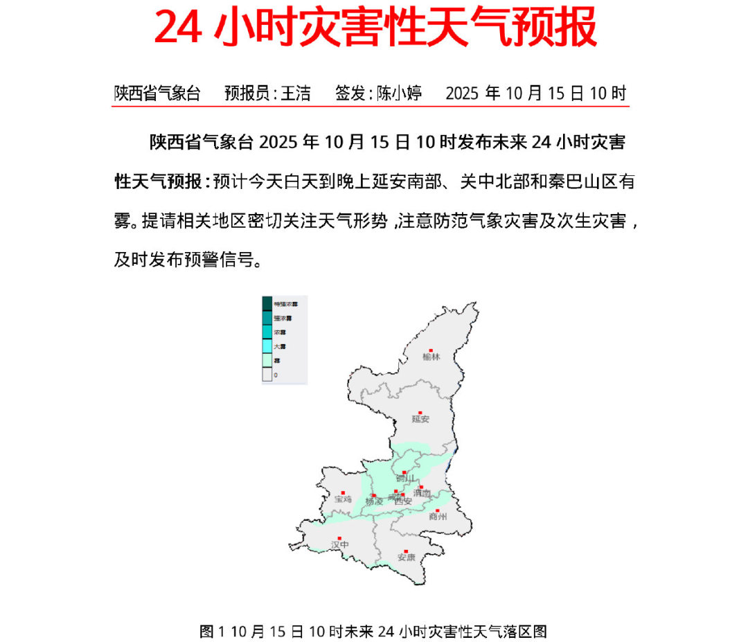 預計今天白天到晚上延安南部、關中北部和秦巴山區有霧。提請相關地區密切關注天氣形勢,注意防範氣象災害及次生災害,及時發佈預警信號。