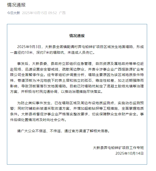 2025年9月3日,大新縣全茗鎮配偶村弄屯鉛鋅礦項目區域發生地面塌陷,形成一直徑約10米、深約7米的塌陷坑,未造成人員傷亡。